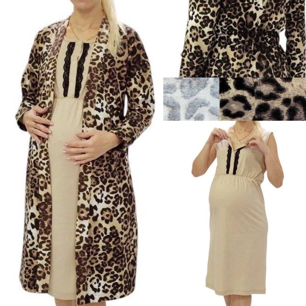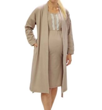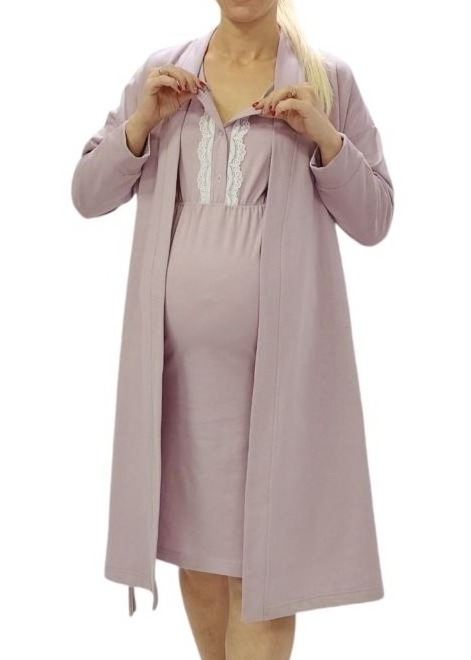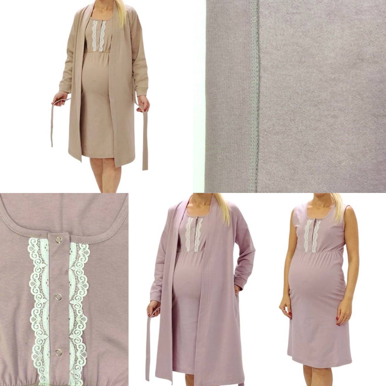 Теплий бавовняний комплект у пологовий будинок. Комплект із халата на легкій байці та трикотажна нічна сорочка на широких бретелях та кнопках для зручного годування. Прикрашений мереживом.