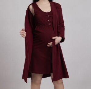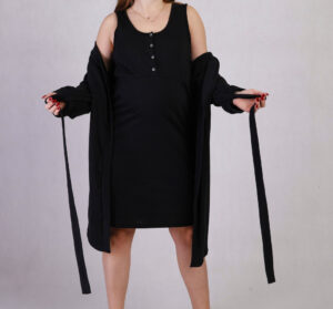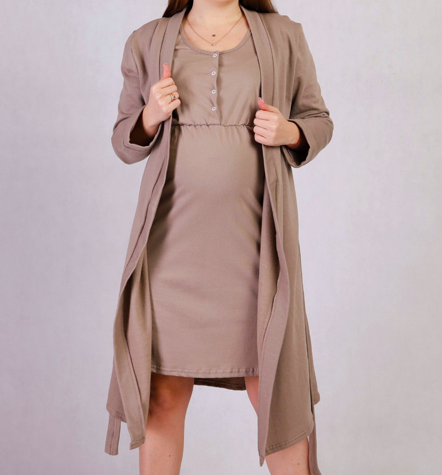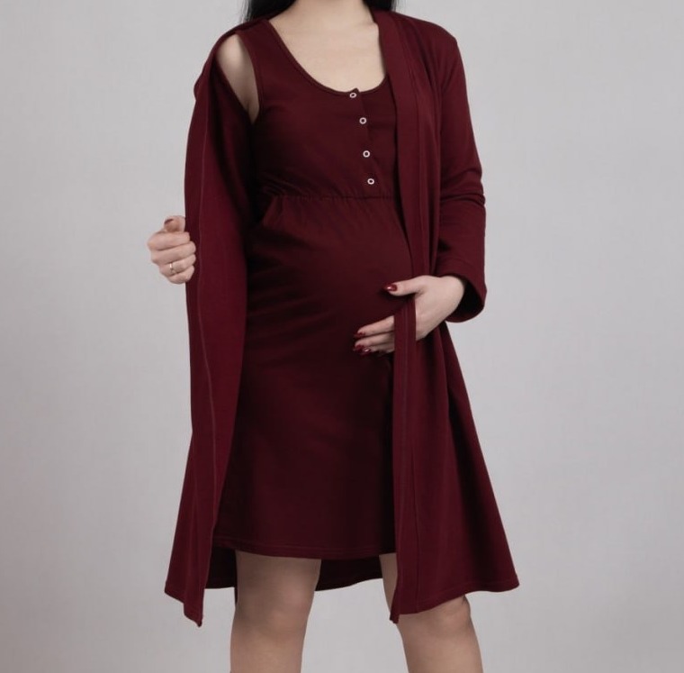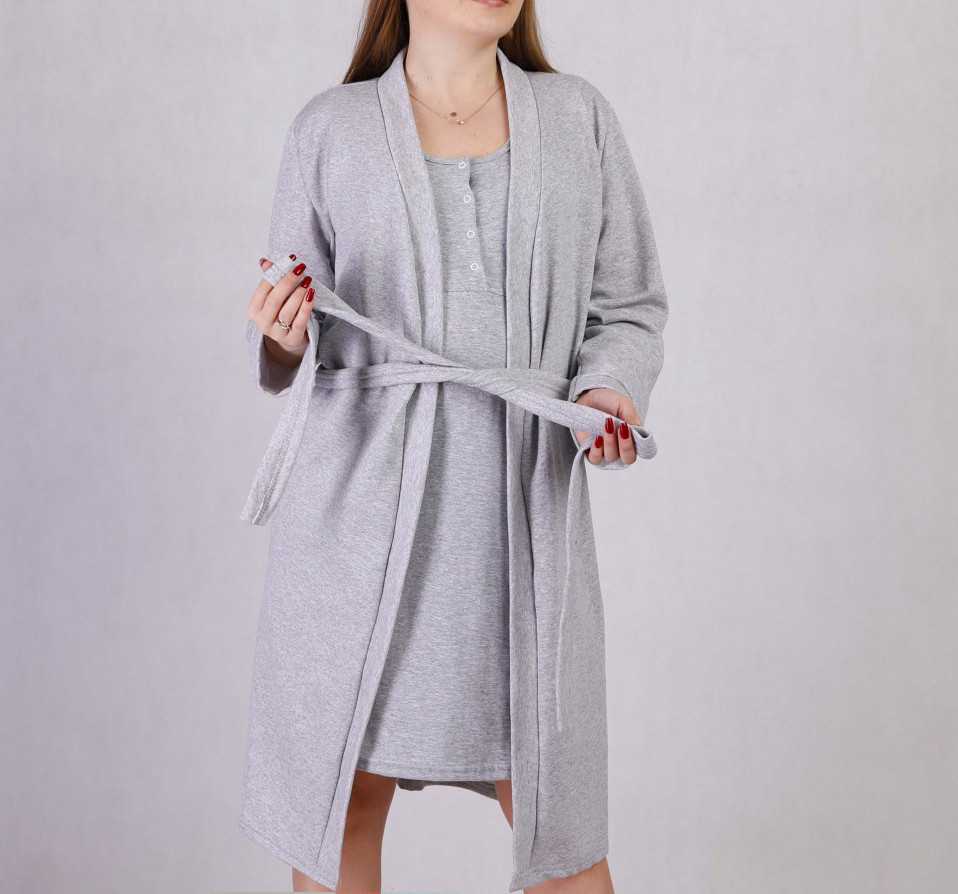 Халат на запах має дві кишені та поясок, довгий рукав. Нічна з планкою та на легкій резинці, що зручно для майбутніх і годуючих мама.