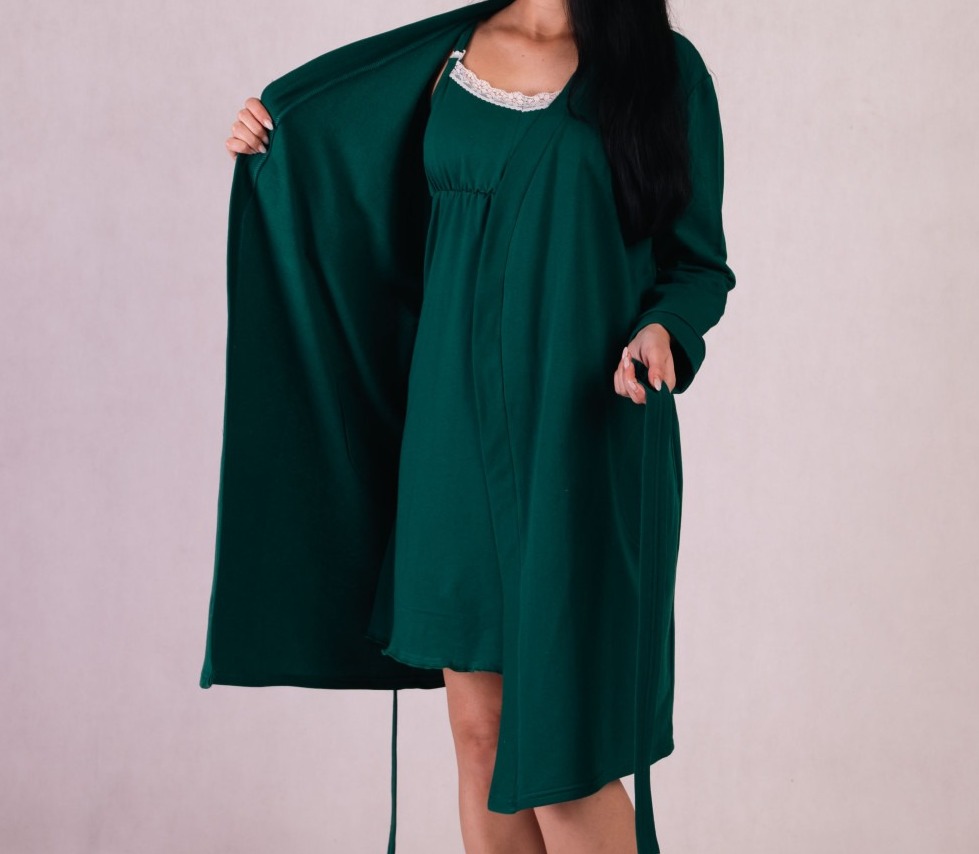 Халат на запах з довгим рукавом ,має дві кишені, і поясок. Брителі нічної на застібках.